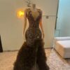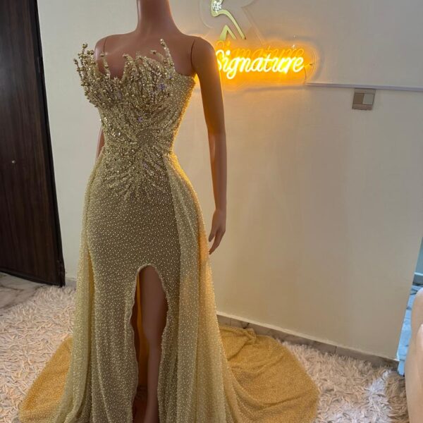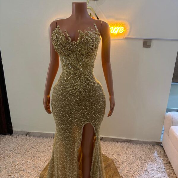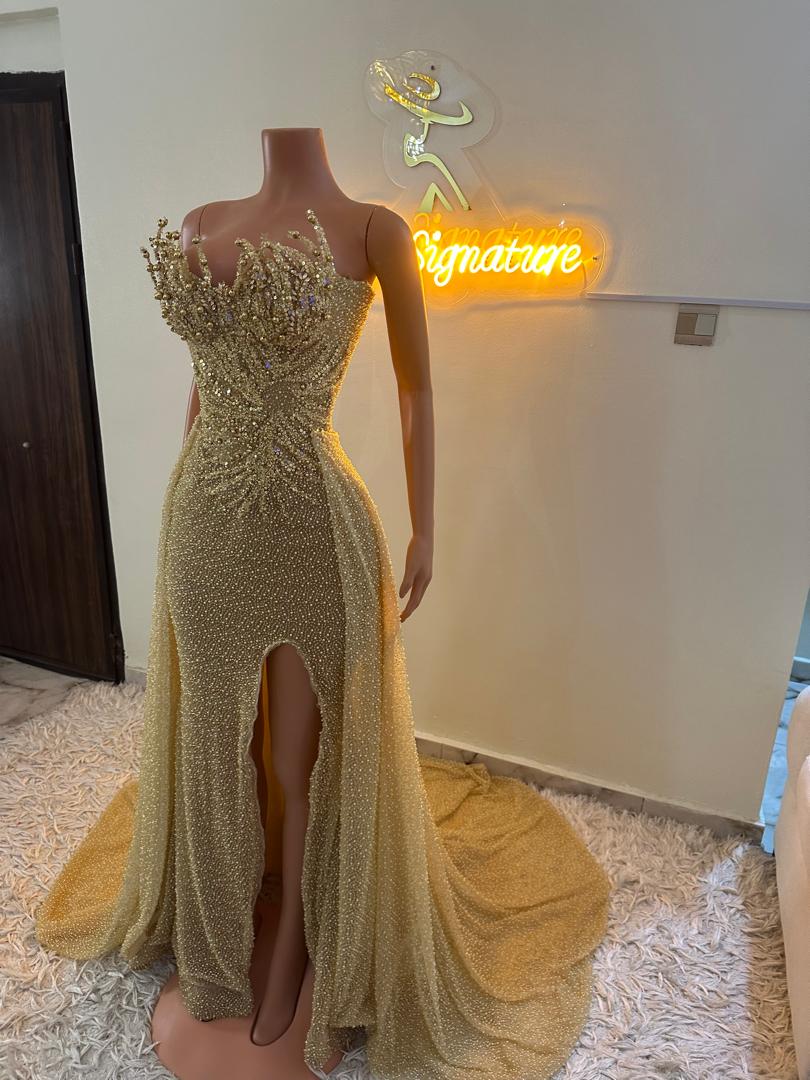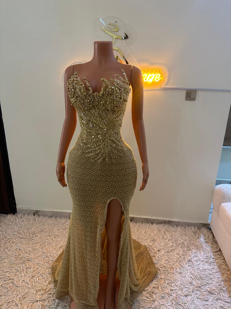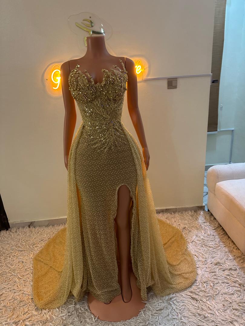 Step into timeless elegance with the Golden Radiance Gown. This shimmering masterpiece features intricate beadwork, a daring thigh-high slit, and a flowing train that exudes sophistication. Designed to make a grand statement, it’s the perfect choice for red-carpet events, prom, or any night you want to shine.